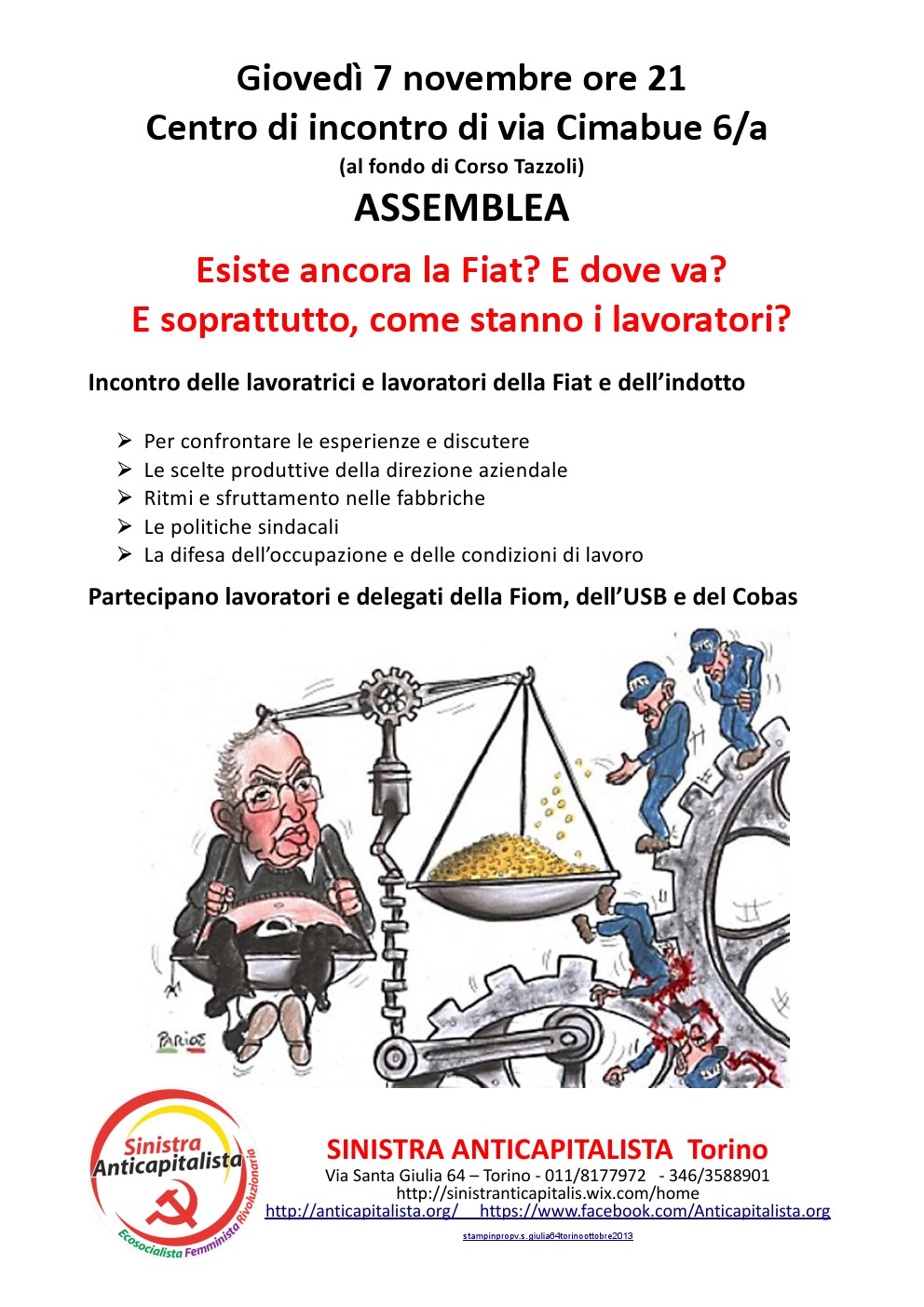 In vista dell’assemblea di giovedì 7 novembre ore 21:00 centro di incontro di via Cimabue 6/a (al fondo di Corso Tazzoli), a cui abbiamo invitato a partecipare al dibattito quadri e sindacalisti delle diverse organizzazioni, è stata fatta un’intervista al compagno Pasquale Loiacono delle carrozzerie di Mirafiori.