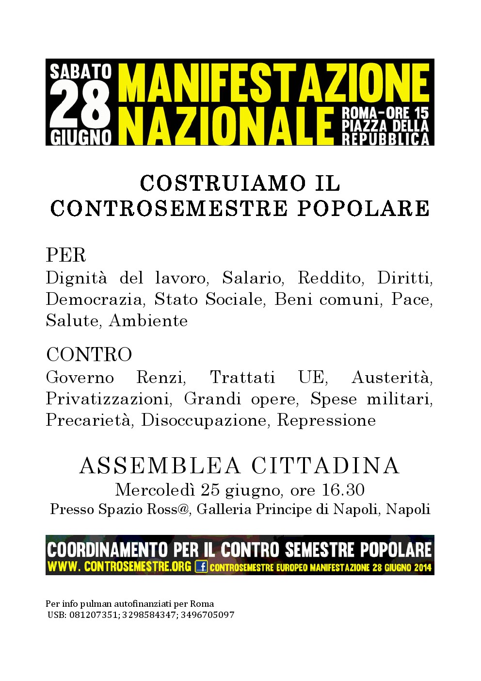 In vista della manifestazione nazionale del 28 giugno a Roma per un controsemestre popolare di lotta, si terrà a Napoli; Mercoledì 25 giugno alle ore 16.30, un’assemblea cittadina, presso Spazio Ross@, Galleria Principe di Napoli, indetta dal coordinamento per un controsemestre popolare.