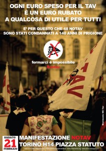 Sabato 21 si terrà a Torino la manifestazione popolare indetta dal Movimento No Tav. Il concentramento è alle ore 14 in Piazza Statuto.