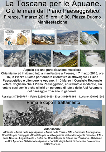 Sinistra Anticapitalista aderisce alla manifestazione indetta in difesa delle Apuane che si terrà sabato prossimo a Firenze, perché quello che sarà sottoposto all’approvazione del Consiglio regionale sulle cave e sulle Apuane costituisce una vergogna rispetto alla tutela dell’ambiente e del paesaggio, ma anche l’esplicitazione del fatto che il governo della Toscana si è rivelato come il diretto rappresentante dei padroni del marmo e delle lobbies del carbonato di calcio.
