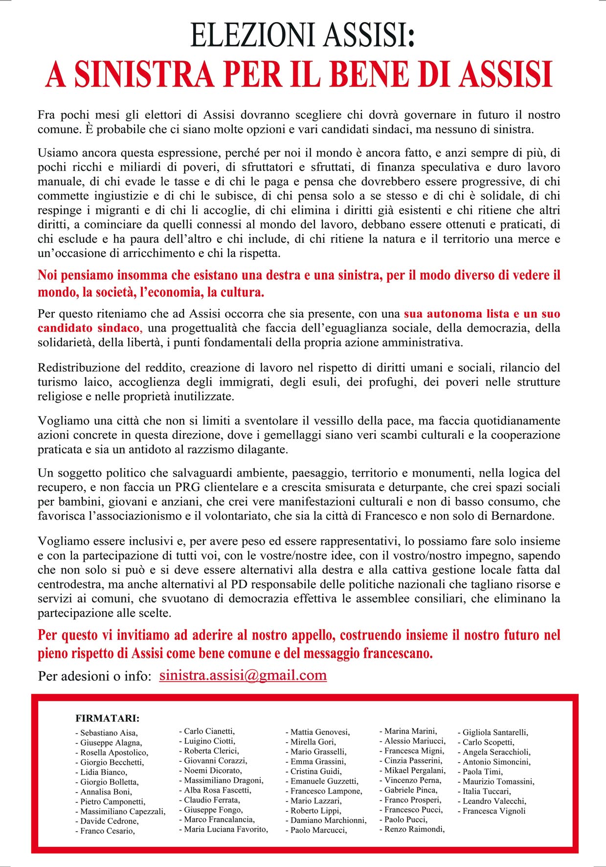 Per questo riteniamo che ad Assisi occorra che sia presente, con una sua autonoma lista e un suo candidato sindaco, una progettualità che faccia dell’eguaglianza sociale, della democrazia, della solidarietà, della libertà, i punti fondamentali della propria azione amministrativa.