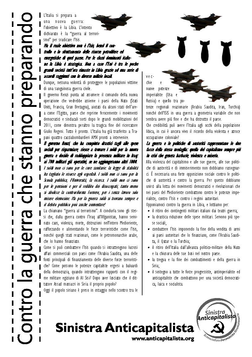 Il governo Renzi punta ad assumere il comando della nuova operazione che vedrebbe assieme i paesi della Nato (Stati Uniti, Francia, Gran Bretagna), aiutati da alcuni stati dell’area come l’Egitto, paese che reprime ferocemente i movimenti democratici e sindacali sorti dopo le grandi mobilitazioni del 2011, come dimostra peraltro la tragica fine del ricercatore Giulio Regeni. Tutto è pronto. L’Italia ha già trasferito a Trapani quattro cacciabombardieri AMX pronti a intervenire.