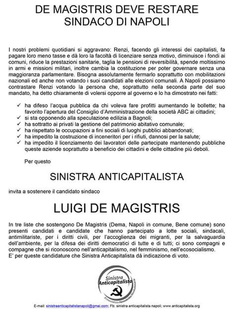 In tre liste che sostengono De Magistris (Dema, Napoli in comune, Bene comune) sono presenti candidati e candidate che hanno partecipato a lotte sociali, sindacali, antimilitariste, per i diritti civili, per l’accoglienza dei migranti, per la salvaguardia dell’ambiente, per la difesa dei diritti democratici di tutte e di tutti; ci sono compagni e compagne che si riconoscono nell’anticapitalismo, nel femminismo, nell’ecosocialismo.