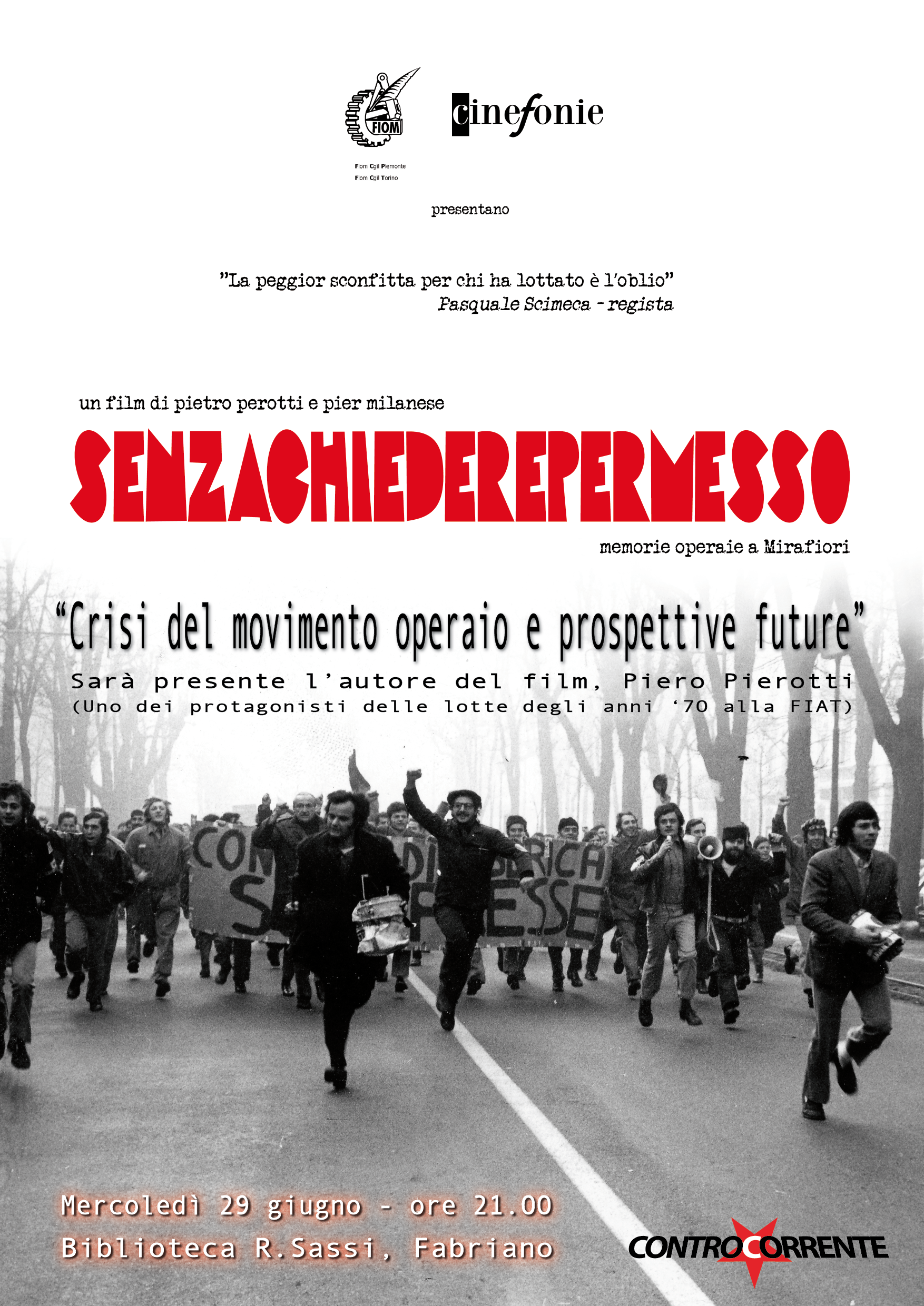 Il Collettivo ControCorrente di Fabriano (AN), che le/i compagne/i di Sinistra Anticapitalista Marche sostengono, organizza la proiezione del film “Senza chiedere il permesso” di Pietro Perotti e Pier Milanese sulle lotte degli anni 60 e 70 alla Fiat Mirafiori.