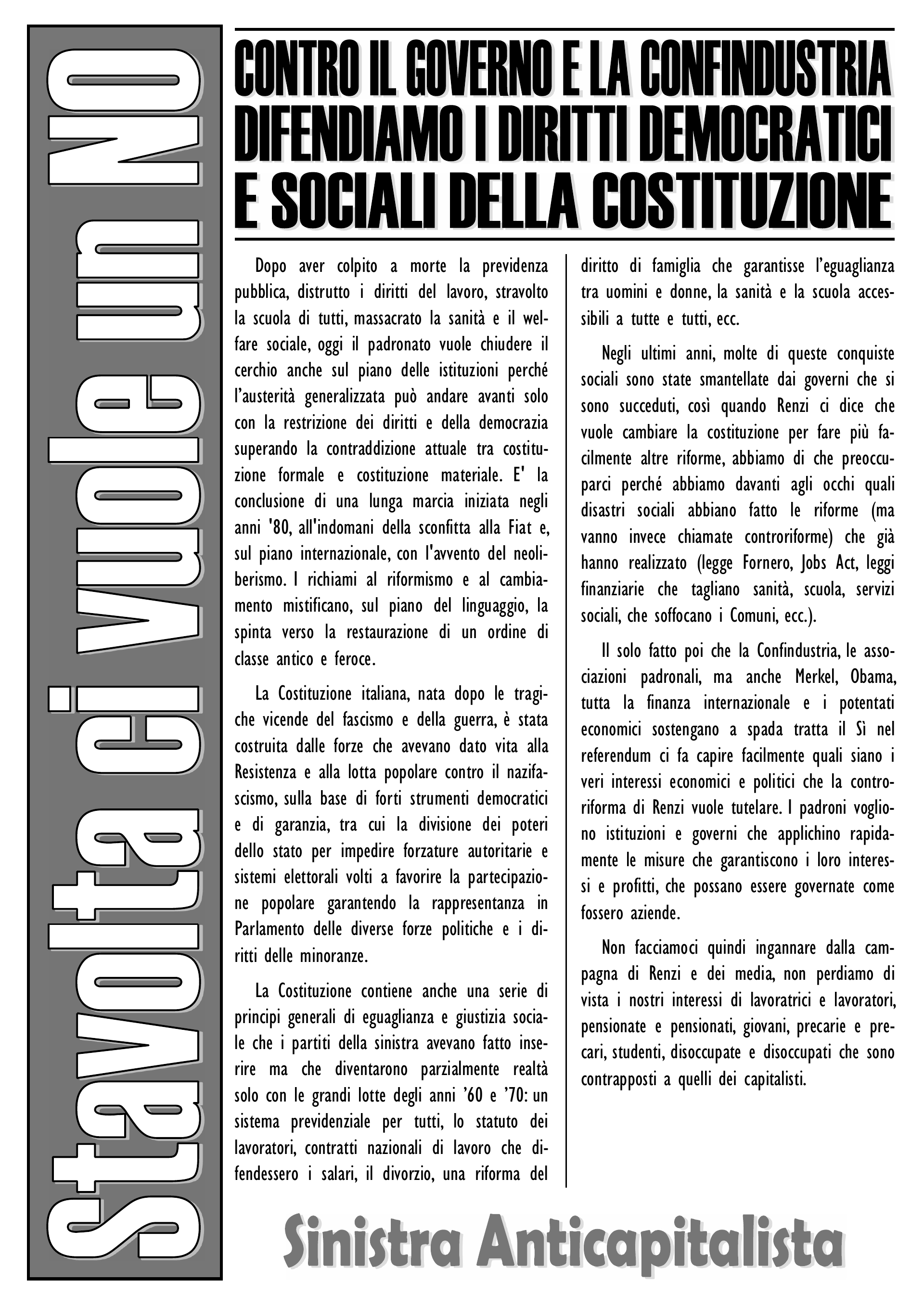 Non facciamoci quindi ingannare dalla campagna di Renzi e dei media, non perdiamo di vista i nostri interessi di lavoratrici e lavoratori, pensionate e pensionati, giovani, precarie e precari, studenti, disoccupate e disoccupati che sono contrapposti a quelli dei capitalisti.