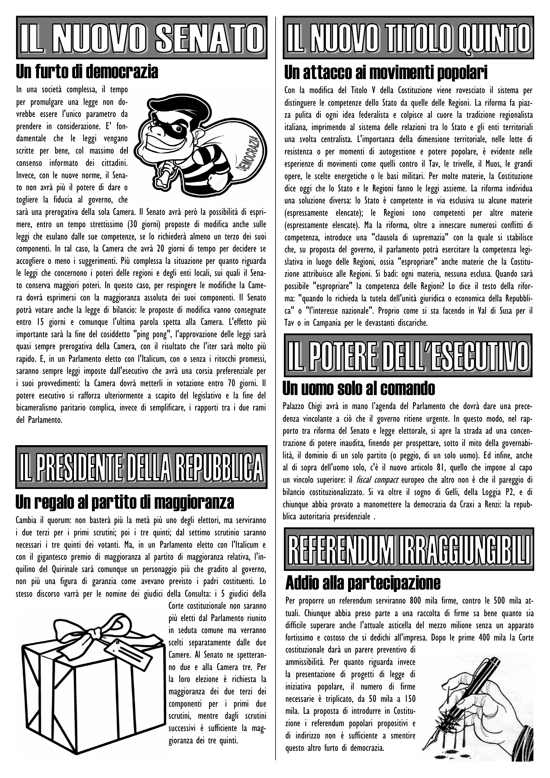Con la modifica del Titolo V della Costituzione viene rovesciato il sistema per distinguere le competenze dello Stato da quelle delle Regioni. La riforma fa piazza pulita di ogni idea federalista e colpisce al cuore la tradizione regionalista italiana, imprimendo al sistema delle relazioni tra lo Stato e gli enti territoriali una svolta centralista. L’importanza della dimensione territoriale, nelle lotte di resistenza o per momenti di autogestione e potere popolare, è evidente nelle esperienze di movimenti come quelli contro il Tav, le trivelle, il Muos, le grandi opere, le scelte energetiche o le basi militari. Per molte materie, la Costituzione dice oggi che lo Stato e le Regioni fanno le leggi assieme. La riforma individua una soluzione diversa: lo Stato è competente in via esclusiva su alcune materie (espressamente elencate); le Regioni sono competenti per altre materie (espressamente elencate). Ma la riforma, oltre a innescare numerosi conflitti di competenza, introduce una “clausola di supremazia” con la quale si stabilisce che, su proposta del governo, il parlamento potrà esercitare la competenza legislativa in luogo delle Regioni, ossia “espropriare” anche materie che la Costituzione attribuisce alle Regioni. Si badi: ogni materia, nessuna esclusa. Quando sarà possibile “espropriare” la competenza delle Regioni? Lo dice il testo della riforma: “quando lo richieda la tutela dell’unità giuridica o economica della Repubblica” o “l’interesse nazionale”. Proprio come si sta facendo in Val di Susa per il Tav o in Campania per le devastanti discariche.