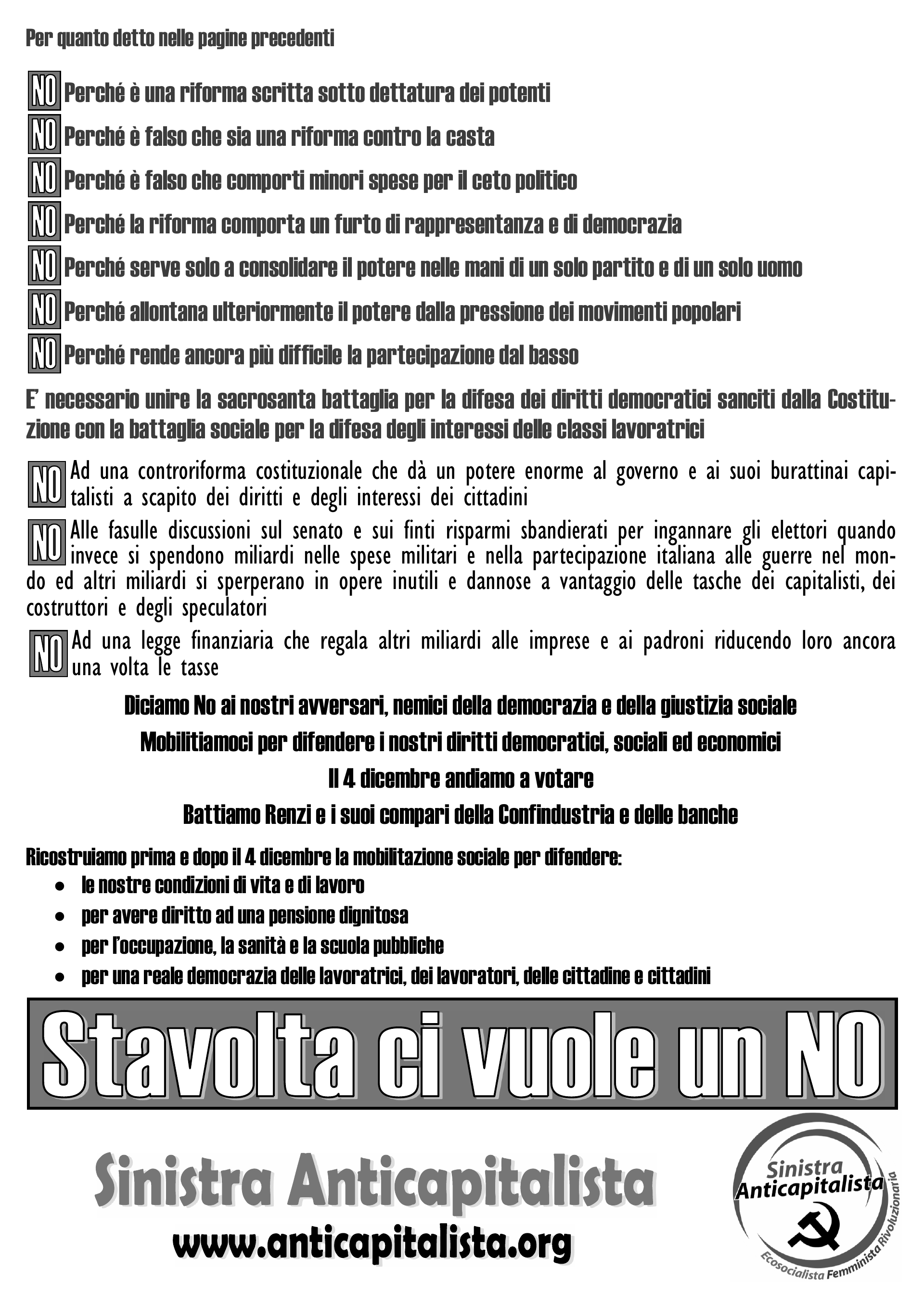 NO Alle fasulle discussioni sul senato e sui finti risparmi sbandierati per ingannare gli elettori quando invece si spendono miliardi nelle spese militari e nella partecipazione italiana alle guerre nel mondo ed altri miliardi si sperperano in opere inutili e dannose a vantaggio delle tasche dei capitalisti, dei costruttori e degli speculatori