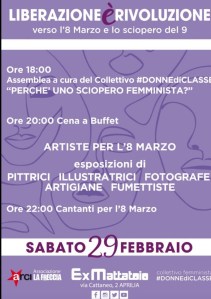 Con questa iniziativa intendiamo dare lancio alla mobilitazione dell’8 marzo e spiegare le ragioni dello sciopero femminista del 9 marzo in un’assemblea aperta in cui interverrà Giovanna Russo del collettivo femminista #DONNEdiCLASSE. Finita l’assemblea è prevista la cena in loco e dopo cena si esibiranno numerose cantanti locali e durante tutto il pomeriggio e la sera saranno esposte le opere di fumettiste, pittrici, illustratrici, fotografe e artigiane. Ognuna presterà la sua arte a sostegno di queste due giornate di mobilitazione.