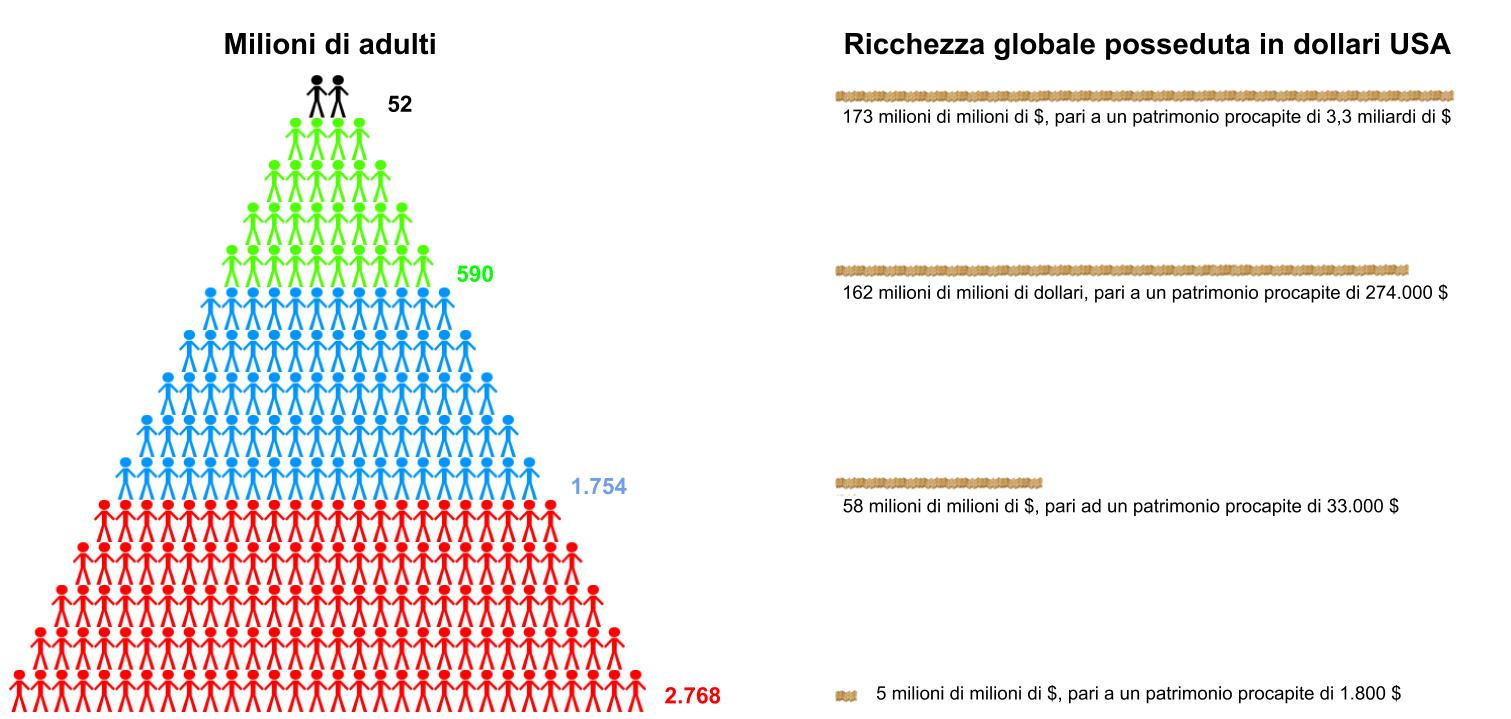 Il rapporto di Credit Suisse non si concentra solo sui super-ricchi, ma allarga la sua analisi anche ai ricchi, delinenando quella che è la piramide dei patrimoni globali. L’1% degli adulti del pianeta (pari a 52 milioni di persone che hanno a disposizione patrimoni di almeno 1 milione di dollari) detiene il 43% della ricchezza mondiale, il successivo 11,4% che comprende 590 milioni di adulti (che godono di patrimoni compresi tra i 100.000 dollari e il milione, detiene il 40% della ricchezza globale. Ad avere patrimoni familiari compresi tra i 10.000 e 100.000 dollari sono un miliardo e 754 milioni di individui adulti che posseggono il 14,7% delle ricchezze. I restanti 2 miliardi e 768 milioni di adulti (il 53,6% del totale), con proprietà individuali inferiori ai 10.000 dollari, detengono solo l’1,4% della ricchezza globale.