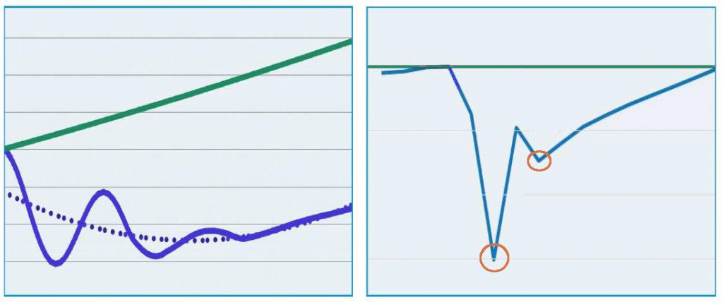 Queste previsioni sono evidentemente molto aleatorie nella misura in cui dipendono assolutamente dall’evoluzione globale della pandemia: il ritmo della sua diffusione (o della sua progressiva estinzione) imprime un profilo specifico alle evoluzioni economiche. L’intreccio fra crisi sanitaria e ciclo economico è una delle caratteristiche inedite di questa crisi, cosa che abbiamo sottolineato in un precedente contributo[8] ed illustrato con il grafico seguente (a sinistra). La si può paragonare con il grafico di destra, che illustra la previsione della OCDE per la zona euro[9], per cui il livello di attività di prima della crisi non sarà raggiunto che alla fine del 2022. Si riscontra l’impatto dei lockdown, ma la curva riprende subito la sua traiettoria. Tutte le altre previsioni della OCDE (come di altre istituzioni) vanno così al rimorchio dei colpi di scena sanitari.