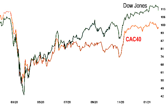 Da un certo punto di vista, il ministro del bilancio francese ha ragione: l’attuale politica di riacquisti del BCE non è “sostenibile nel tempo”. Questi acquisti massicci di titoli -i Quantitative easing– hanno in effetti permesso il doping dei corsi borsistici, ed è una delle caratteristiche di questa crisi quella di non aver avuto un impatto duraturo sulle Borse. Il grafico seguente dimostra che lo shock iniziale della pandemia ha certamente fatto crollare i prezzi di circa un terzo fra gennaio e la fine di marzo 2020. Poi, grazie alla politica di intervento massiccio delle banche centrali, i corsi borsistici hanno ritrovato il movimento al rialzo, più significativo negli Stati Uniti (Dow Jones) che in Francia (CAC40).