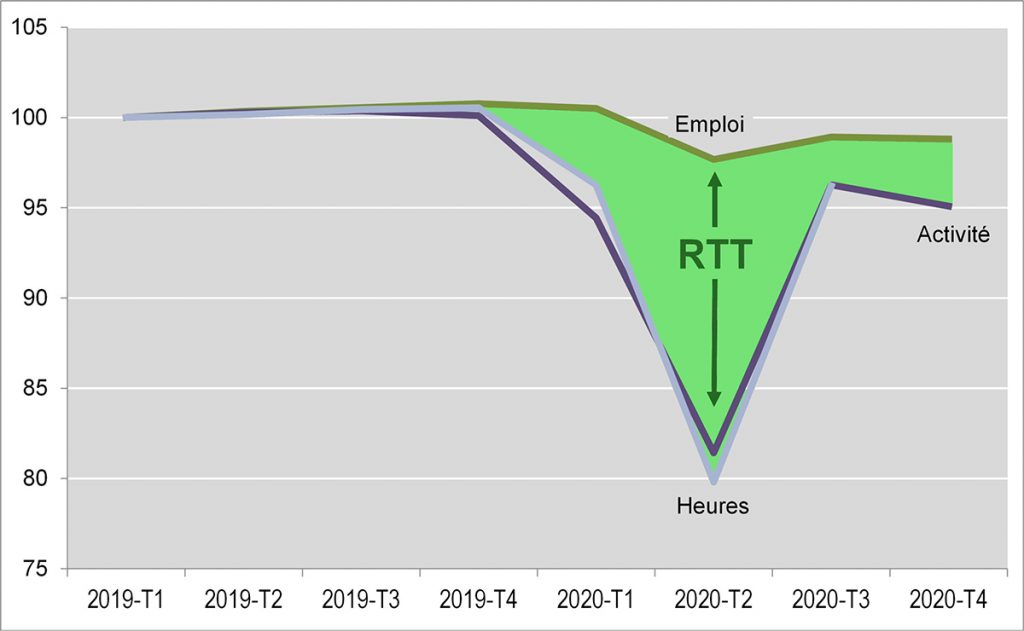 Abbiamo descritto sopra il mantenimento del personale legato ai meccanismi della disoccupazione parziale. Questo meccanismo è ancor meglio illustrato dal grafico seguente[33]. Si può osservare che la caduta dell’attività del secondo trimestre 2020 ha comportato una diminuzione equivalente del numero di ore lavorate. Ma il calo dell’occupazione è stato in gran parte ammortizzato da diverse forme di riduzione del tempo di lavoro (RTT) che sono state qualificate come “difensive”: è la zona verde del grafico. Il vuoto è stato parzialmente colmato nel terzo trimestre ma rimane uno scarto di circa il 4% fra l’occupazione e ciò che sarebbe “conforme” (a parità di condizioni) a livello dell’attività.