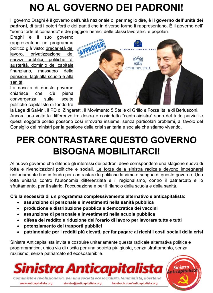 Il governo Draghi è il governo dell’unità nazionale o, per meglio dire, è il governo dell’unità dei padroni, di tutti i poteri forti e dei partiti che in diverse forme li rappresentano. È il governo dell’ “uomo forte al comando” e dei peggiori nemici delle classi lavoratrici e popolari.