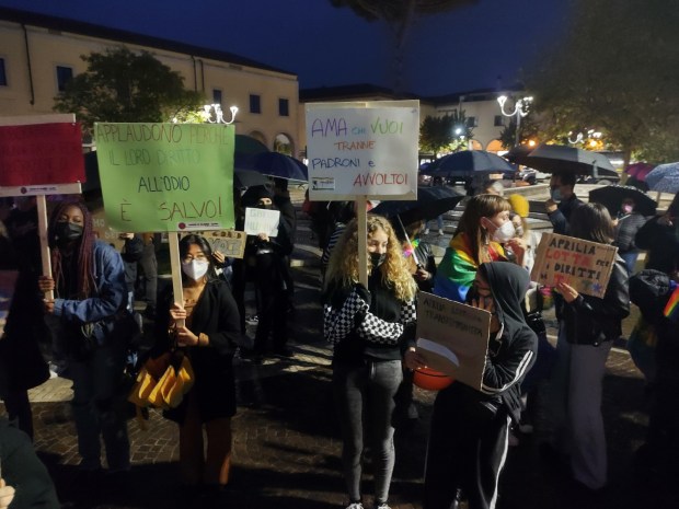 “Applausi sporchi di sangue”, “L’omotransfobia non è un’opinione”, “Siamo il vento, non la bandiera” sono alcune delle scritte sui cartelli portati in piazza ad Aprilia, ieri 6 novembre, da diverse decine di giovanissime e giovanissimi per dire la loro sull’affossamento del DDL ZAN e rivendicare diritti per le persone LGBTQIA+.