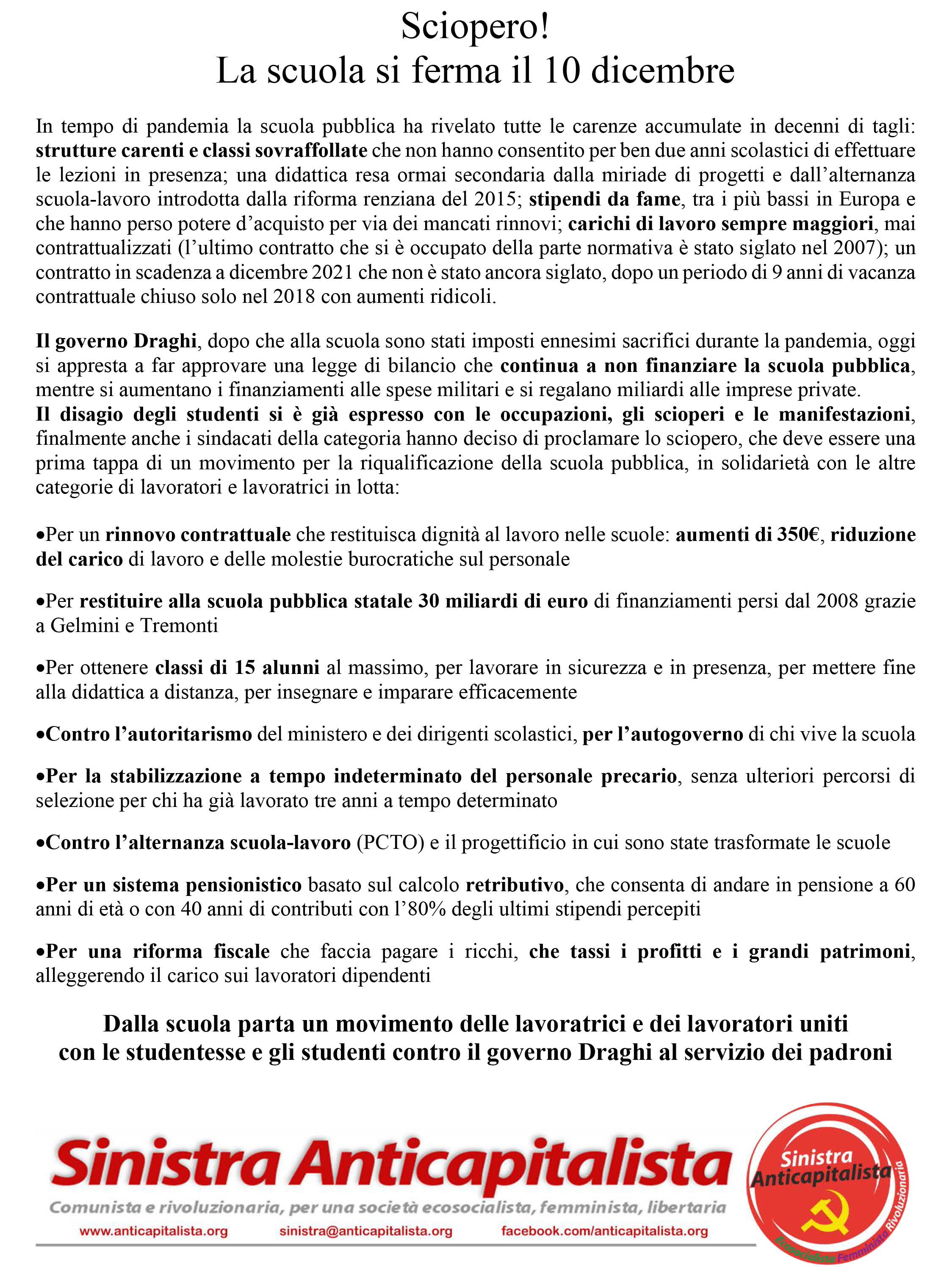 Il governo Draghi, dopo che alla scuola sono stati imposti ennesimi sacrifici durante la pandemia, oggi si appresta a far approvare una legge di bilancio che continua a non finanziare la scuola pubblica, mentre si aumentano i finanziamenti alle spese militari e si regalano miliardi alle imprese private.