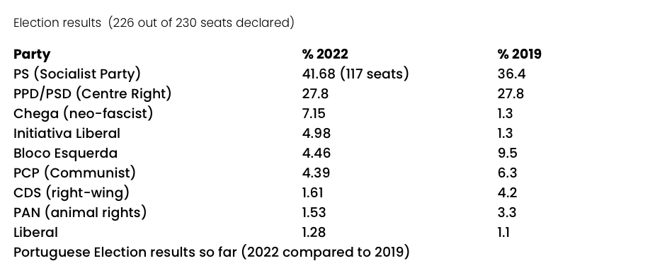 Per inciso, per gli oppositori della rappresentanza proporzionale, anche a sinistra, questa elezione dimostra che si possono ottenere maggioranze assolute con un sistema elettorale più equo. Inoltre, nonostante la sconfitta della sinistra, il sistema di rappresentanza proporzionale più democratico in Portogallo significa che possono mantenere un gruppo più piccolo di deputati e quindi beneficiare anche nella sconfitta di una presenza nazionale sui media.