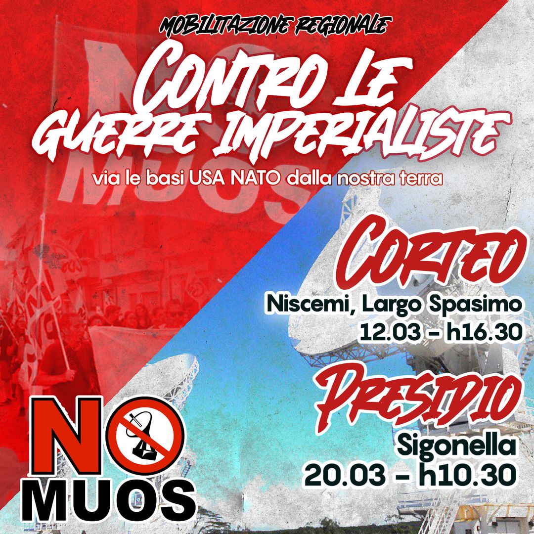 Dalla Sicilia il nostro NO ALLA GUERRA deve essere ancora più forte, per il ruolo che hanno le basi Usa e Nato, a partire da Sigonella, la grande stazione aeronavale da cui quotidianamente decollano i droni-spia di USA e NATO e i pattugliatori P-8A “Poseidon” per le operazioni di intelligence anti-russe nel Mediterraneo orientale e nel Mar Nero; da Augusta, centro di rifornimento strategico delle navi da guerra Nato e dei sottomarini nucleari USA; da Catania-Fontanarossa, scalo “civile” utilizzato per gli elicotteri anti-sottomarini della Marina militare; da Niscemi dove le antenne NRTF e il MUOS della Marina USA trasmettono gli ordini di morte alle unità militari degli Stati uniti schierate in tutto il pianeta.