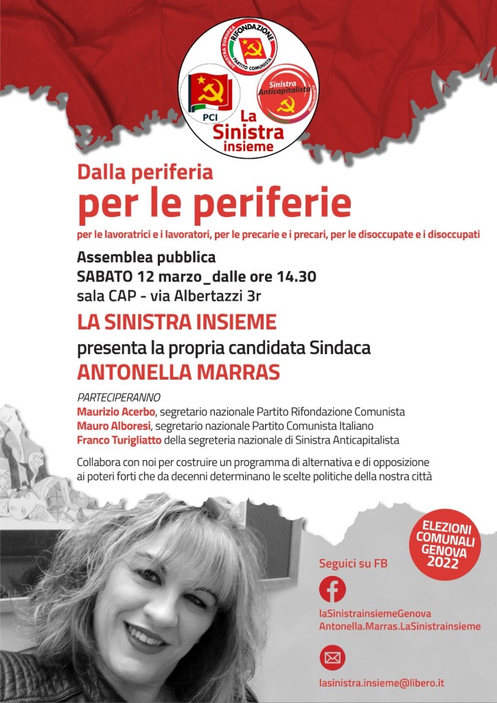 Il prossimo sabato 12 marzo, con inizio alle ore 14.30, presso il Circolo del CAP (g.c.), in via A. Albertazzi, 3 r., si svolgerà una ASSEMBLEA PUBBLICA di presentazione della lista “La Sinistra insieme”, promossa da Sinistra Anticapitalista, Partito della Rifondazione Comunista e Partito Comunista Italiano per le prossime elezioni comunali a Genova e della candidata sindaca Antonella MARRAS, una donna, una lavoratrice, fortemente rappresentativa di tante battaglie sociali dal basso, ambientaliste e di difesa del territorio, delle periferie.