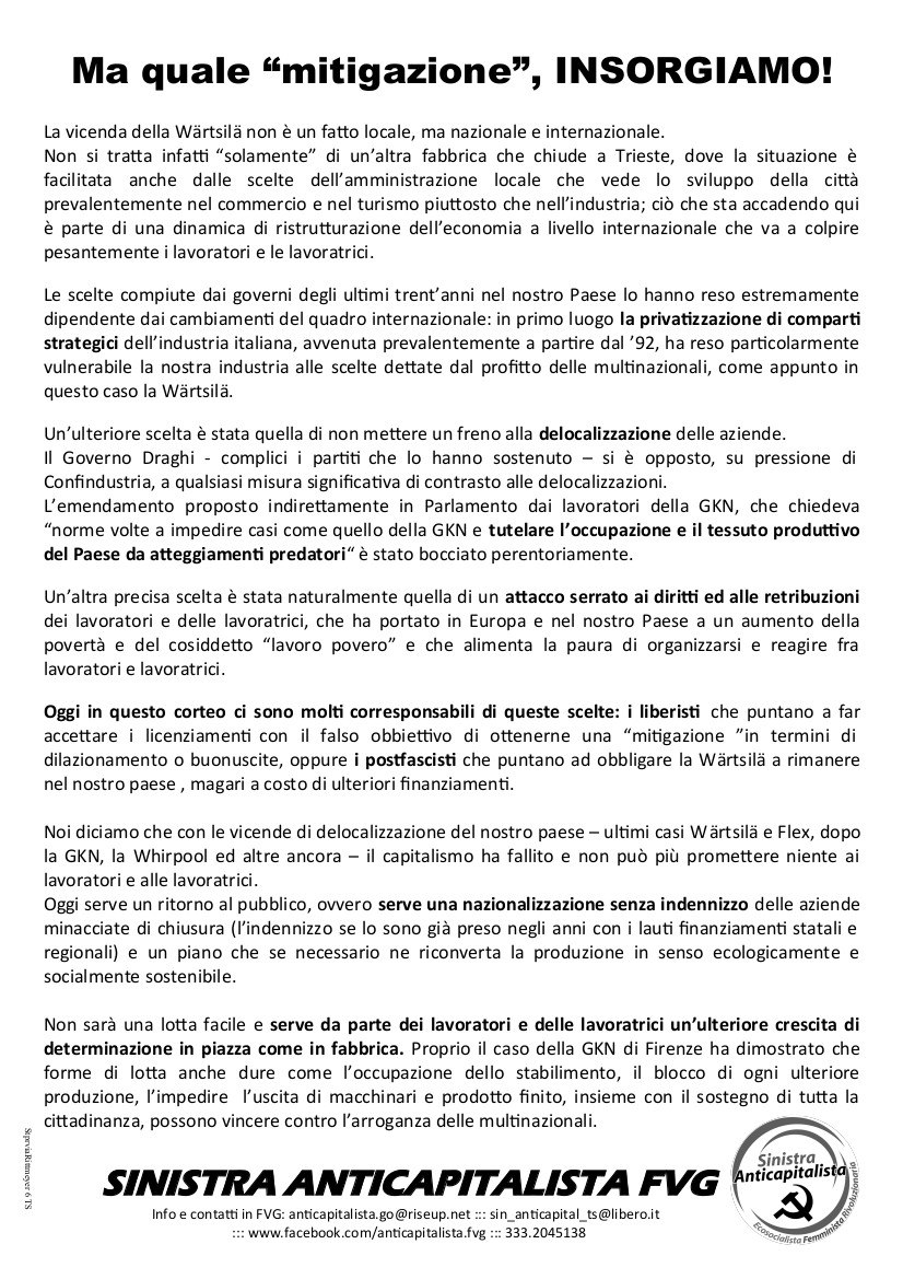 Oggi in questo corteo ci sono molti corresponsabili di queste scelte: i liberisti che puntano a far accettare i licenziamenti con il falso obbiettivo di ottenerne una “mitigazione “in termini di dilazionamento o buonuscite, oppure i postfascisti che puntano ad obbligare la Wärtsilä a rimanere nel nostro paese, magari a costo di ulteriori finanziamenti.