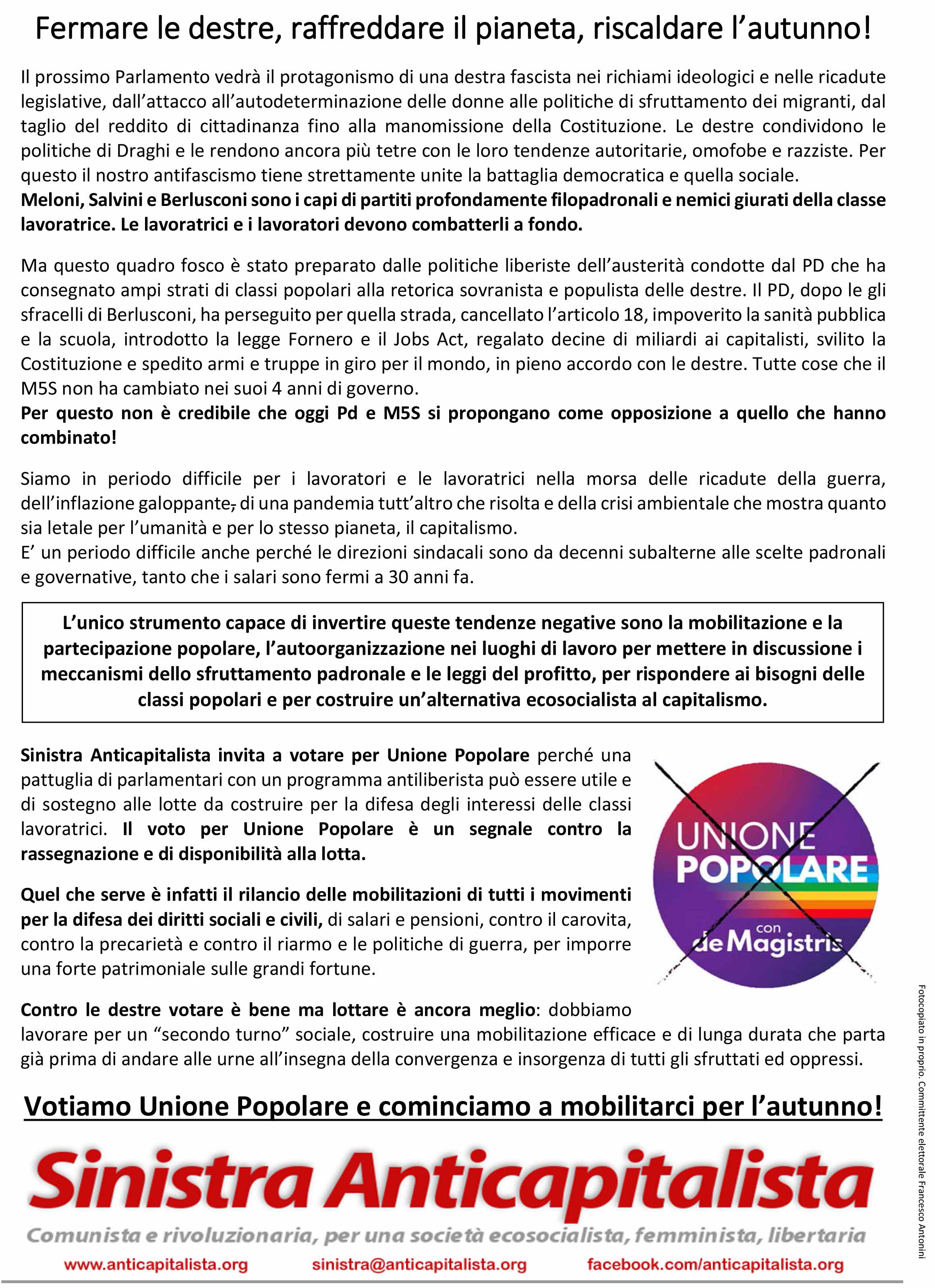 Sinistra Anticapitalista invita a votare per Unione Popolare perché una pattuglia di parlamentari con un programma antiliberista può essere utile e di sostegno alle lotte da costruire per la difesa degli interessi delle classi lavoratrici. Il voto per Unione Popolare è un segnale contro la rassegnazione e di disponibilità alla lotta.