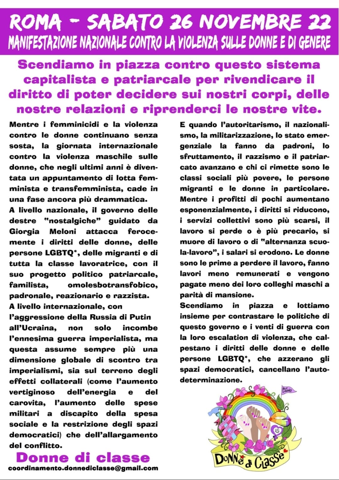 ROMA – SABATO 26 NOVEMBRE – MANIFESTAZIONE NAZIONALE CONTRO LA VIOLENZA MASCHILE SULLE DONNE E DI GENERE