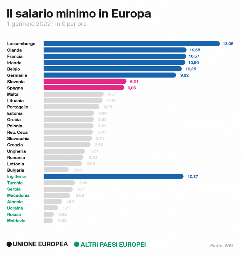 In Europa, su 27 paesi, sono solo sei quelli a non aver introdotto un salario minimo fissato dalla legge. In Italia, la Costituzione prevede il diritto ad una retribuzione “in ogni caso sufficiente ad assicurare a sé e alla famiglia un’esistenza libera e dignitosa” (art. 36) ma non esiste una legge che quantifichi tale diritto. La giurisprudenza è orientata a riconoscere come salario minimo quello fissato dalla contrattazione collettiva del proprio settore, ma ovviamente non è la stessa cosa di avere un minimo fissato per legge, anche per il problema dei contratti pirata sopra citati. Inoltre ci sono settori in cui la retribuzione non garantisce affatto un’esistenza libera e dignitosa, perché magari il contratto scaduto non viene rinnovato o perché, pur di firmare, i dirigenti sindacali si abbassano ad accettare salari da fame.