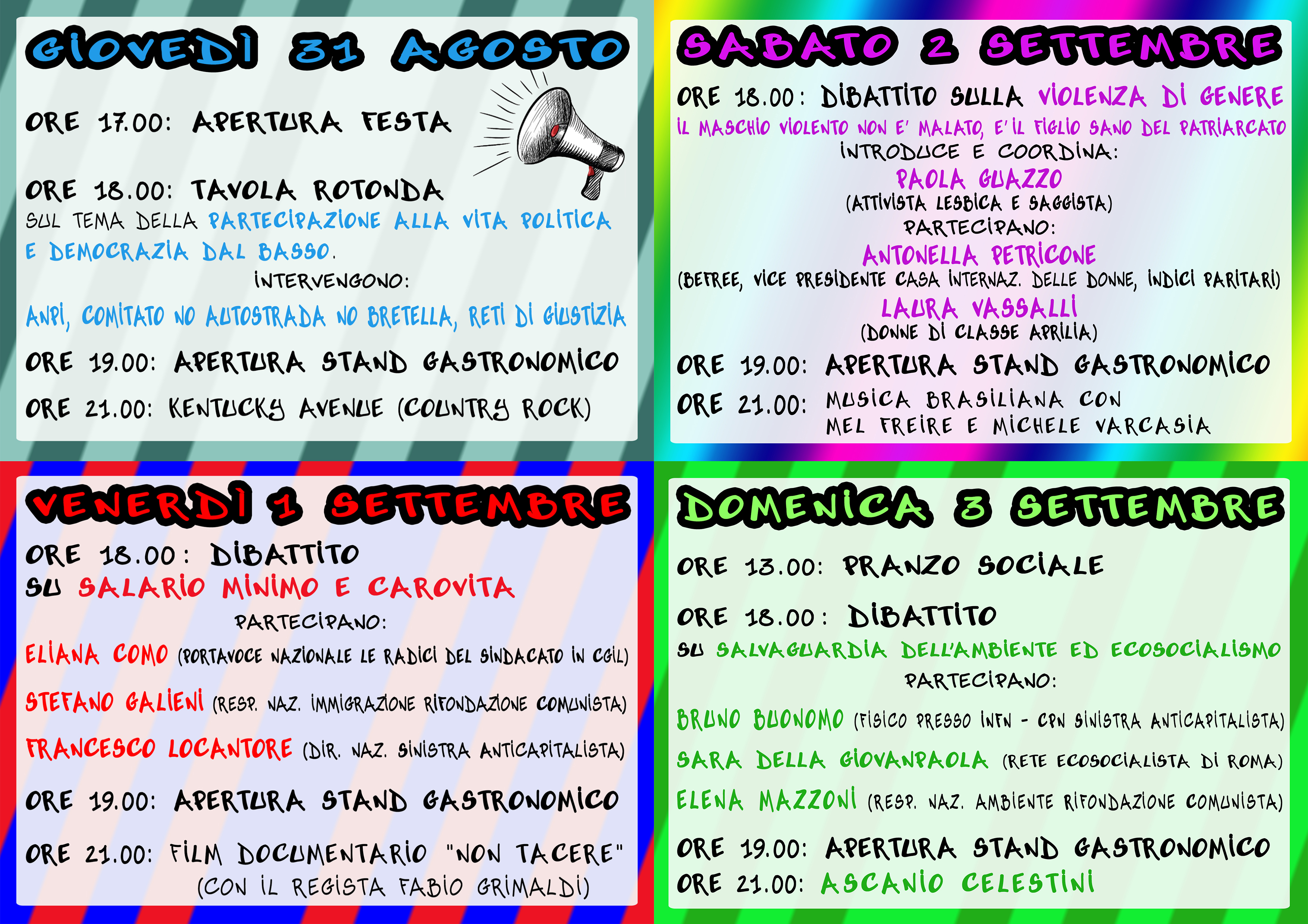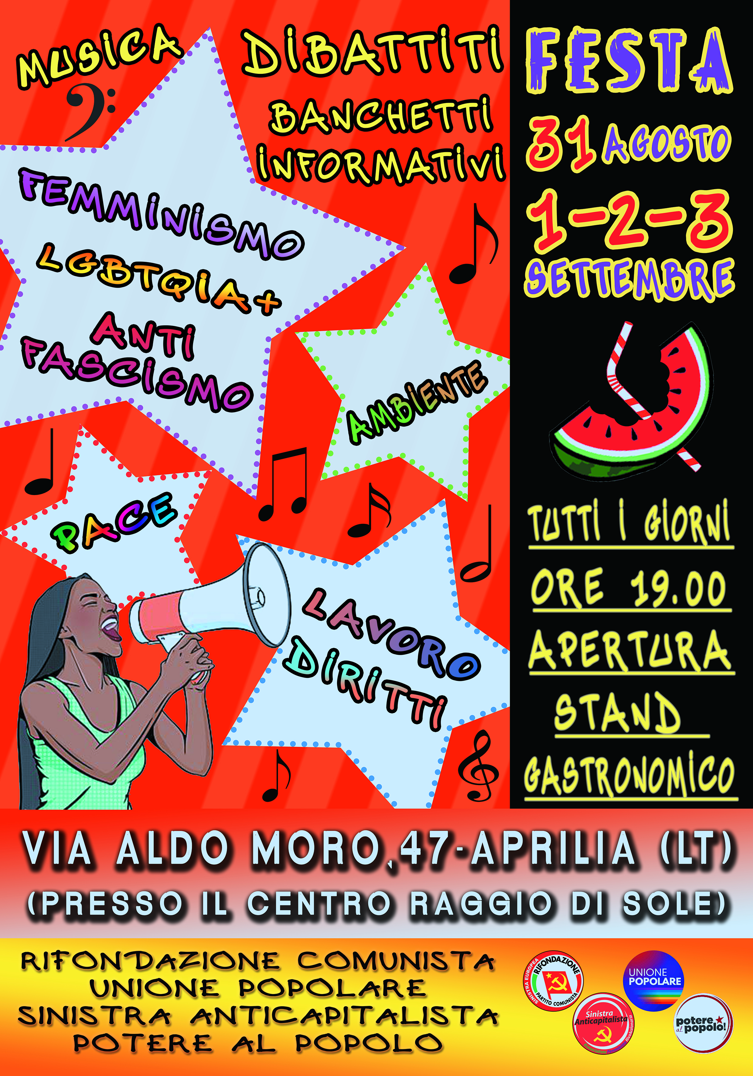 Festa della sinistra radicale di Aprilia dal 31 agosto al 3 settembre in Via Aldo Moro, 47, presso il Centro Raggio di Sole.