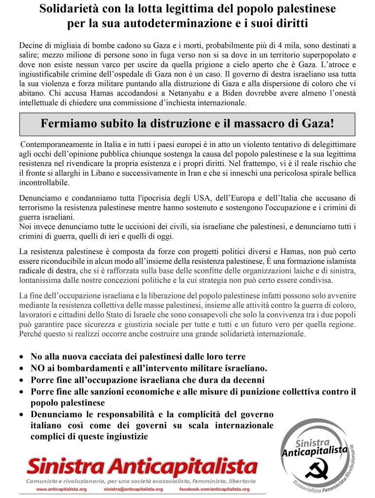 La fine dell’occupazione israeliana e la liberazione del popolo palestinese infatti possono solo avvenire mediante la resistenza collettiva delle masse palestinesi, insieme alle attività contro la guerra di coloro, lavoratori e cittadini dello Stato di Israele che sono consapevoli che solo la convivenza tra i due popoli può garantire pace sicurezza e giustizia sociale per tutte e tutti e un futuro vero per quella regione. Perché questo si realizzi occorre anche costruire una grande solidarietà internazionale.