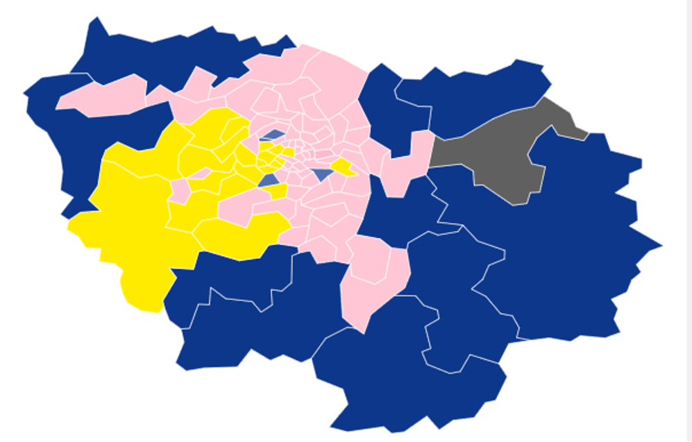 Resta comunque che la sinistra francese continua ad avere un radicamento (non solo elettorale) molto significativo nei quartieri popolari. Basti guardare nell’immagine ai risultati della regione parigina, dove il NFP (rosa) domina (con deputati già eletti o in testa per il ballottaggio) in tutta la parte nordest della capitale e in tutta la periferia popolare dello stesso quadrante, mentre i macroniani (giallo) primeggiano nella zona ovest, più borghese, e la destra lepenista (blu) nelle periferie più lontane.