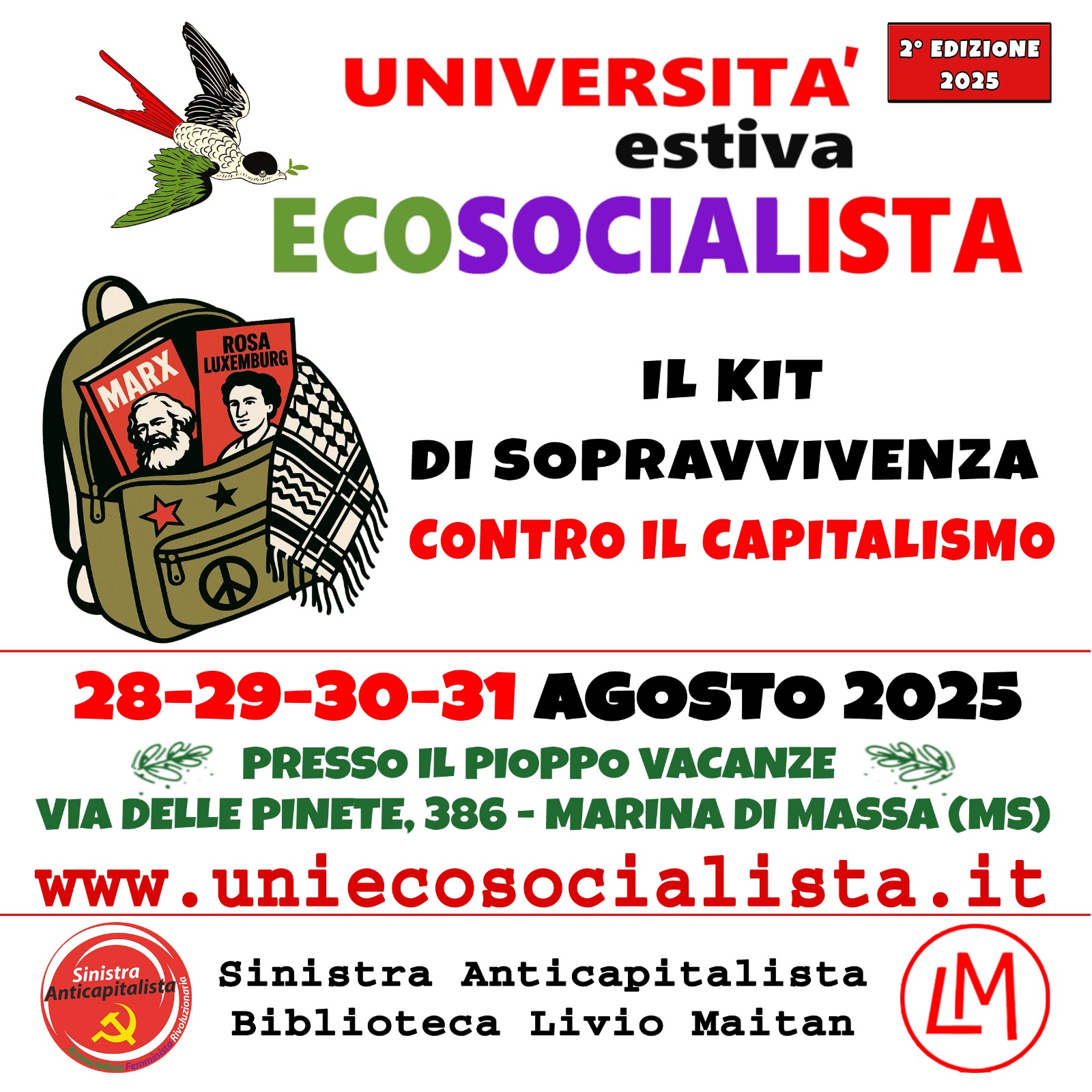 La seconda edizione dell’Università ecosocialista d’estate, organizzata da Sinistra Anticapitalista e dalla Biblioteca Livio Maitan, si terrà a Marina di Massa dal 28 al 31 agosto 2025.