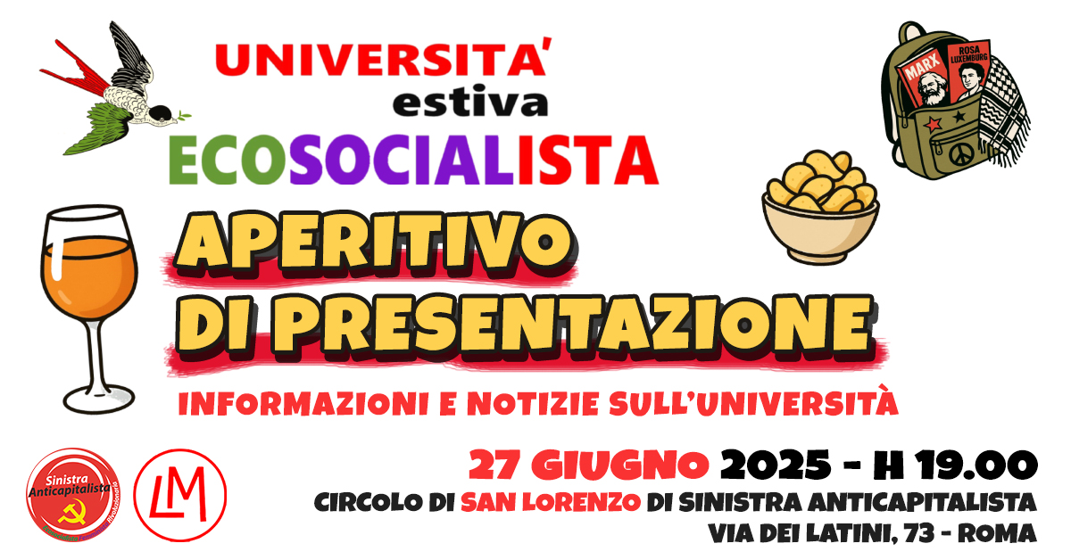 Venerdì 27 giugno alle ore 19:00 al Circolo di San Lorenzo in Via di Latini 73-75, aperitivo di presentazione del programma della seconda edizione dell’Università estiva Ecosocialista, organizzata da Sinistra Anticapitalista e dalla Biblioteca Livio Maitan, che si terrà a Marina di Massa dal 28 al 31 agosto 2025.