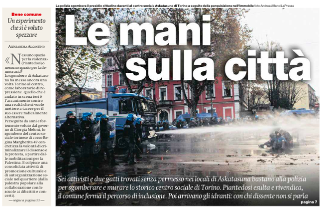 Bene comune Lo sgombero di Askatasuna ha messo ancora una volta Torino al centro, come laboratorio di repressione [Alessandra Algostino da il manifesto]